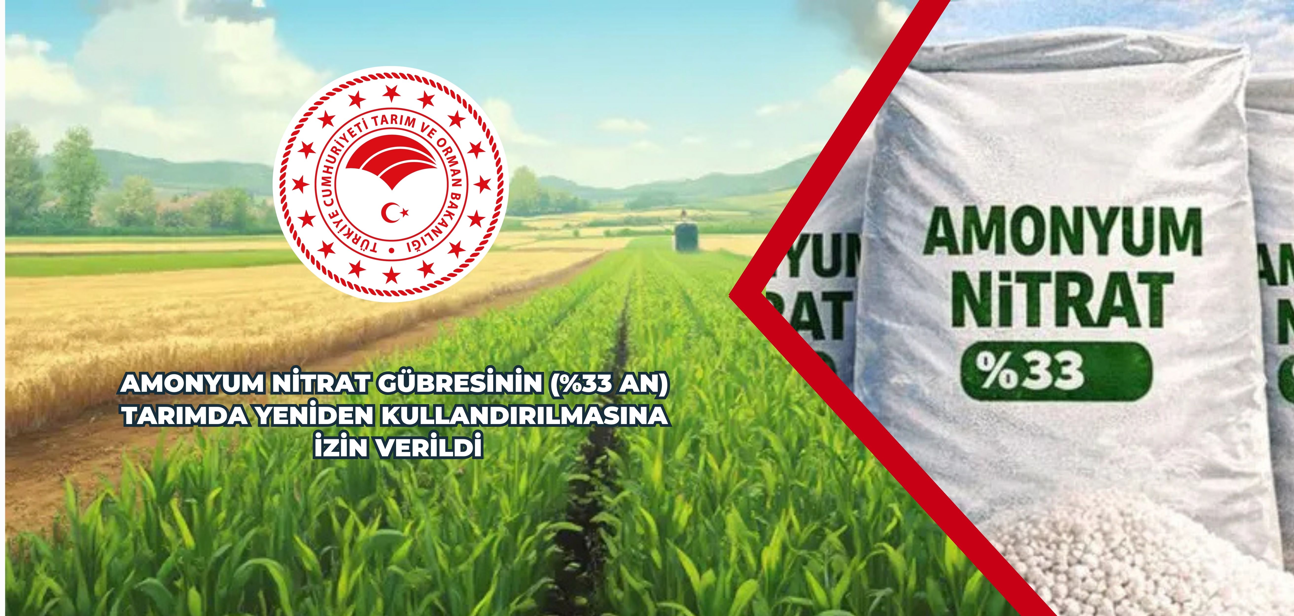 Yaşanan güncel gelişmelerden dolayı; Tarımda Kullanılan Gübrelerin Piyasa Gözetimi ve Denetimi Yönetmeliği kapsamında gübre kullanım sezonu öncesi çiftçilerimizin güvenilir gübreye erişimini sağlamak ve tarımsal faaliyetleri aksatmamak adına, ülkemiz gübre üreticileri tarafından üretilme imkanı bulunan Amonyum Nitrat (%33 AN) Gübresinin tarımda yeniden kullandırılmasına izin verilmiştir.